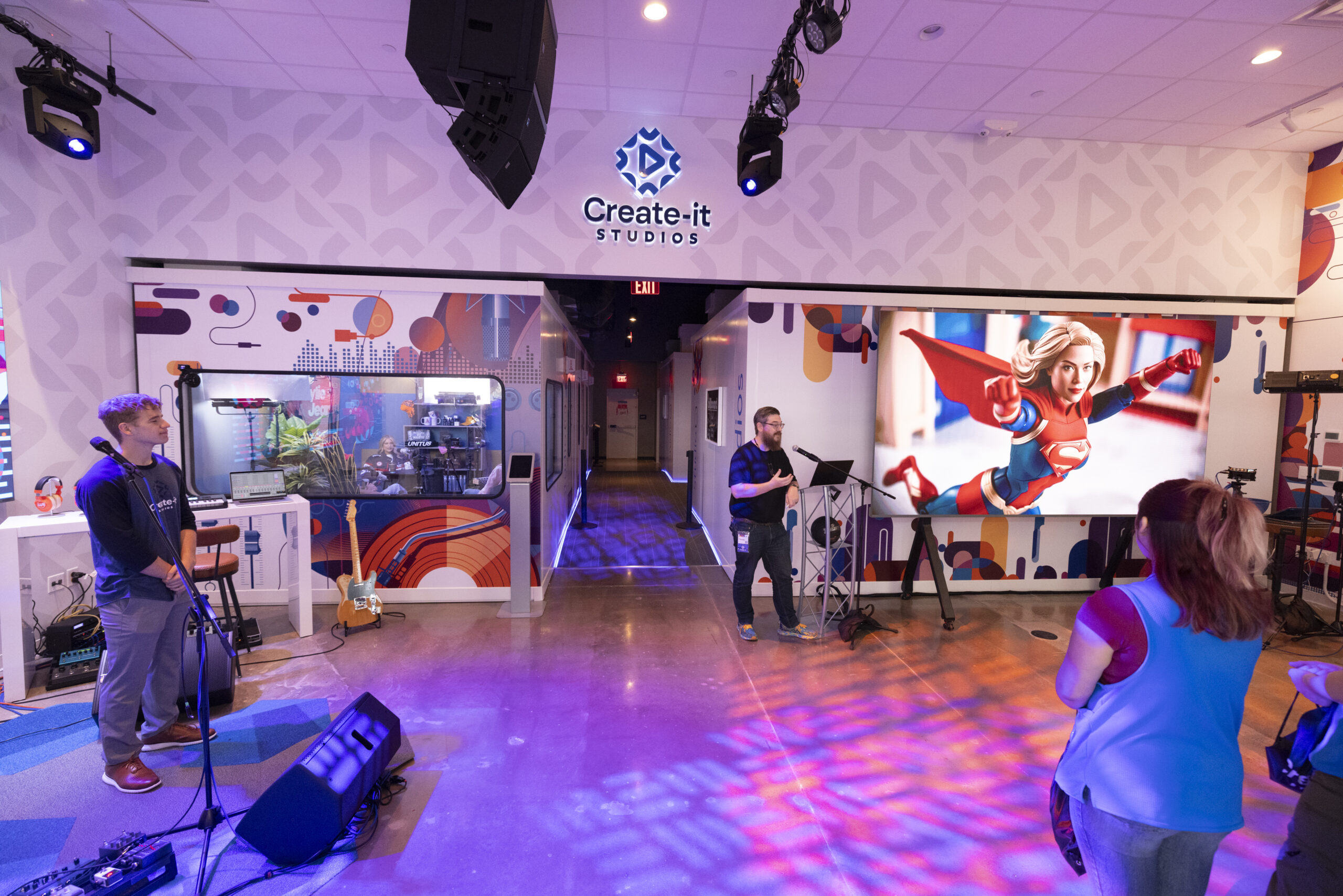 This vision comes to life in a colorful, high-energy studio designed to inspire. Inside its 2,200 square feet are six specialized rooms: two for audio recording, two for podcasting, and two for video, livestreaming, and multimedia work. Each space is designed to adapt to the needs of users, from beginners to working professionals. Equipment, instruction, and support are available, but so is the freedom to explore and learn through hands-on experience.