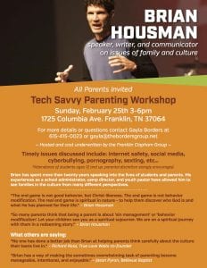 In addition, unlike most forums and seminars of this type that have taken place in our community, our speaker Brian Houseman, well-known authority on today’s web culture, and a former school administrator and youth pastor, and a dad of teens himself, will walk us though how it is less about “behavior modification” and ultimately more about a heart issue.