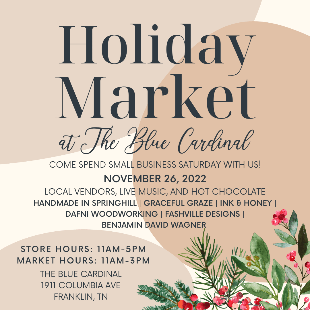 The Blue Cardinal 1911 Columbia Ave, Franklin, TN, United StatesHoliday Market At The Blue Cardinal in Franklin Join The Blue Cardinal on Small Business Saturday for our Holiday Market! […]