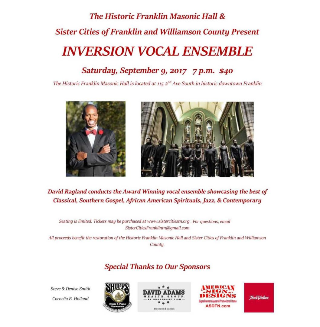 Music Events in Franklin, TN The Historic Franklin Masonic Hall & Sister Cities of Franklin and Williamson County Present INVERSION VOCAL ENSEMBLE Saturday, […]