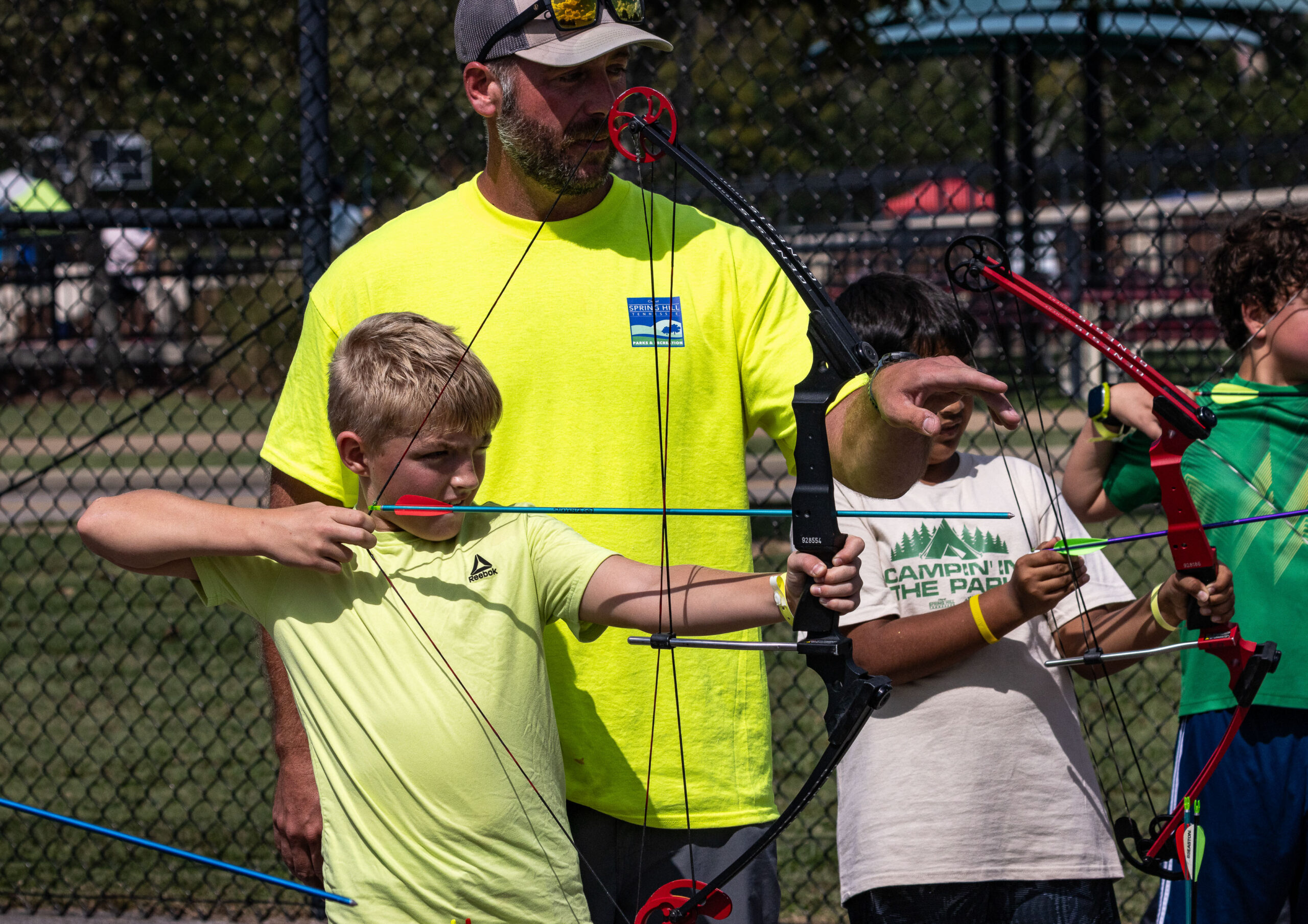 A group of youths take a photo at the archery station during Spring Hill Campin' in the Park on Sept. 27
