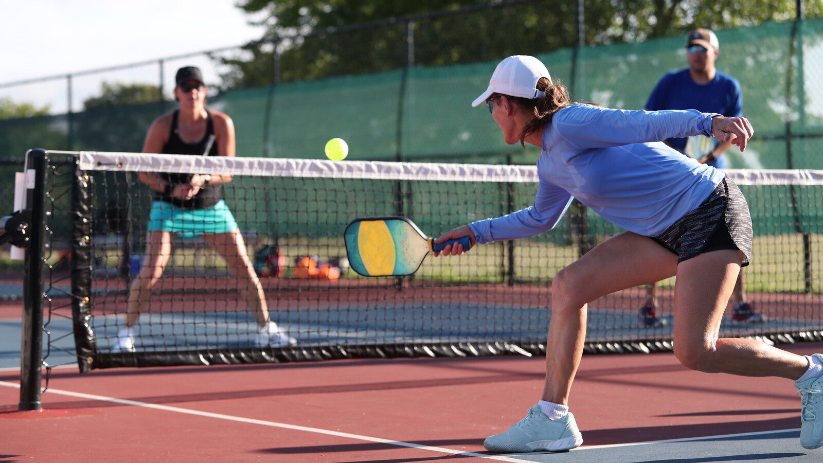 The court, explains Woody, is about half the size of a tennis court, and players use wiffle balls and paddles. “The games are a lot quicker too than tennis. You keep score kind of like volleyball in that you play to 11 points, but you only score when you’re serving.” He says it’s easier on people with knee or hip injuries because the movement isn’t as dramatic.